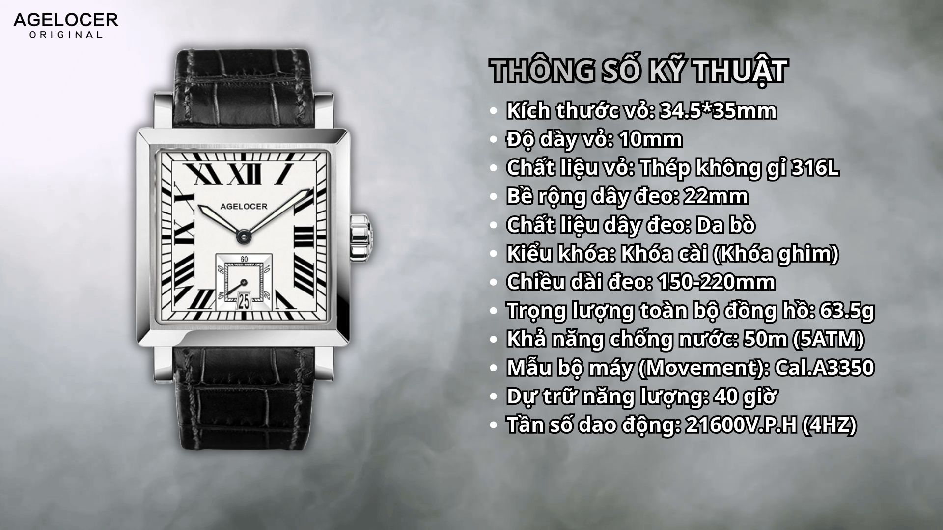 Agelocer Codex 3302A1 là biểu tượng của sự lịch lãm và mạnh mẽ, dành cho quý ông tìm kiếm phong cách chững chạc, độc đáo. Chiếc đồng hồ Thụy Sĩ này nổi bật với thiết kế mặt vuông (kích thước khoảng 35x35mm) đầy khỏe khoắn và táo bạo. Mặt số được chế tác tinh xảo, sử dụng các chữ số La Mã nghiêng sắc nét, tạo nên một tâm điểm thị giác đầy cuốn hút. Về chất liệu, vỏ đồng hồ được làm từ Thép không gỉ 316L bền bỉ, kết hợp với mặt kính Sapphire chống trầy xước. Mẫu 3302A1 sử dụng bộ máy Automatic chính xác và đi kèm dây da cao cấp. Với khả năng chống nước 50m, đây là lựa chọn hoàn hảo, pha trộn giữa vẻ đẹp truyền thống và sự phá cách hiện đại.