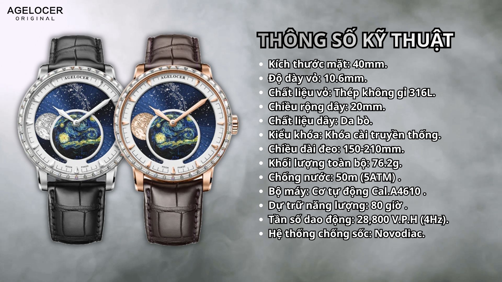 Agelocer 6401F2 là một tuyên ngôn về vẻ đẹp lãng mạn và kỹ thuật cơ khí đỉnh cao. Chiếc đồng hồ này thu hút mọi ánh nhìn với thiết kế vỏ thép mạ Vàng Hồng sang trọng, cùng vòng niềng được đính đá lấp lánh, mang lại cảm giác xa hoa, quý phái. Điểm nhấn nghệ thuật là ô Lịch Tuần Trăng (Moonphase) lớn, tái hiện hành trình của mặt trăng một cách tinh tế. Sức mạnh nội tại của 6401F2 là bộ máy Automatic Cal.A4610 đột phá, tự hào với khả năng dự trữ năng lượng 80 giờ . Bảo vệ tuyệt tác này là Kính Sapphire chống trầy hoàn hảo. Với kích thước 40mm, đây là lựa chọn hoàn hảo cho quý ông tìm kiếm sự kết hợp giữa tính năng phức tạp và đẳng cấp vượt thời gian.