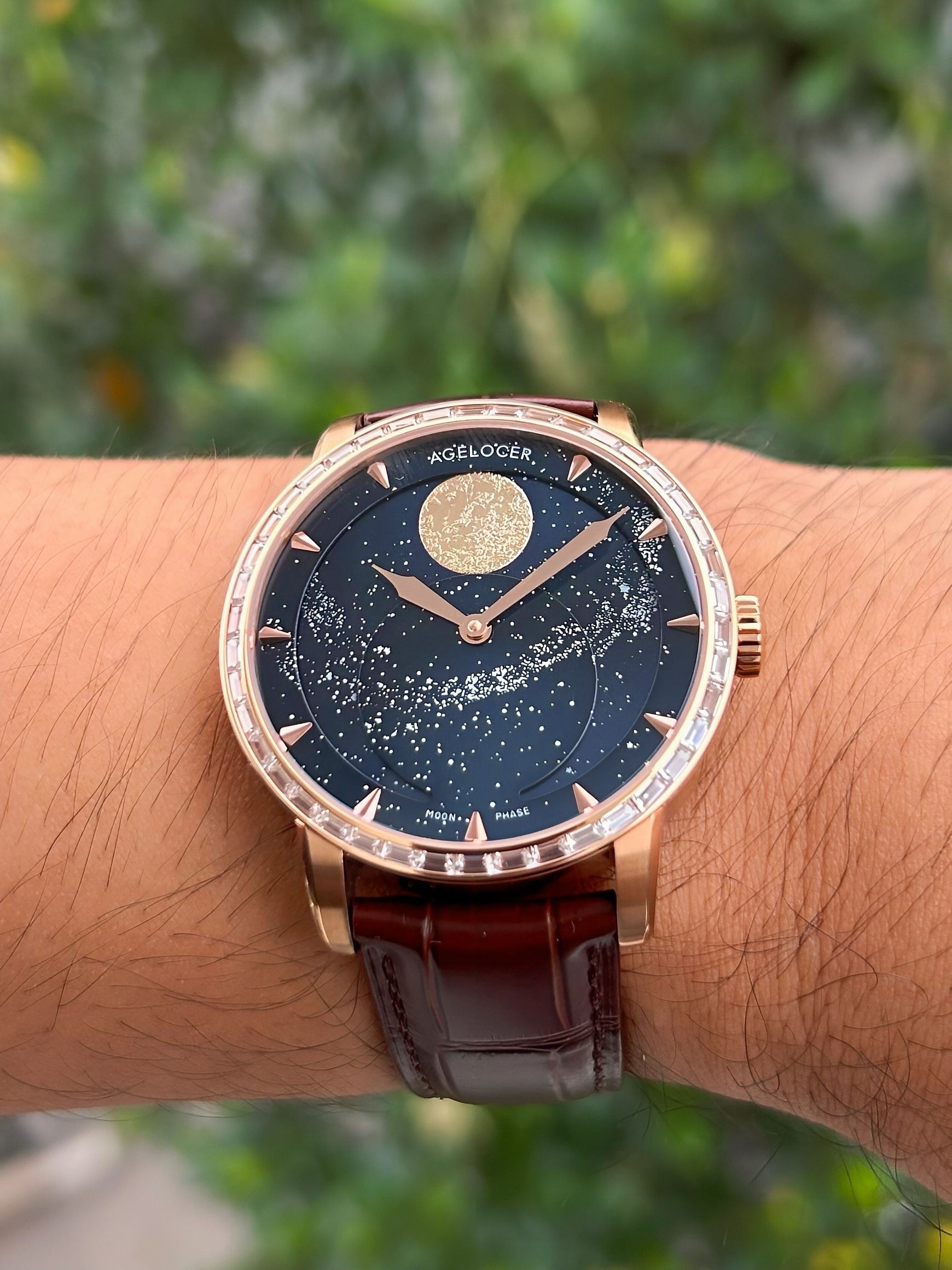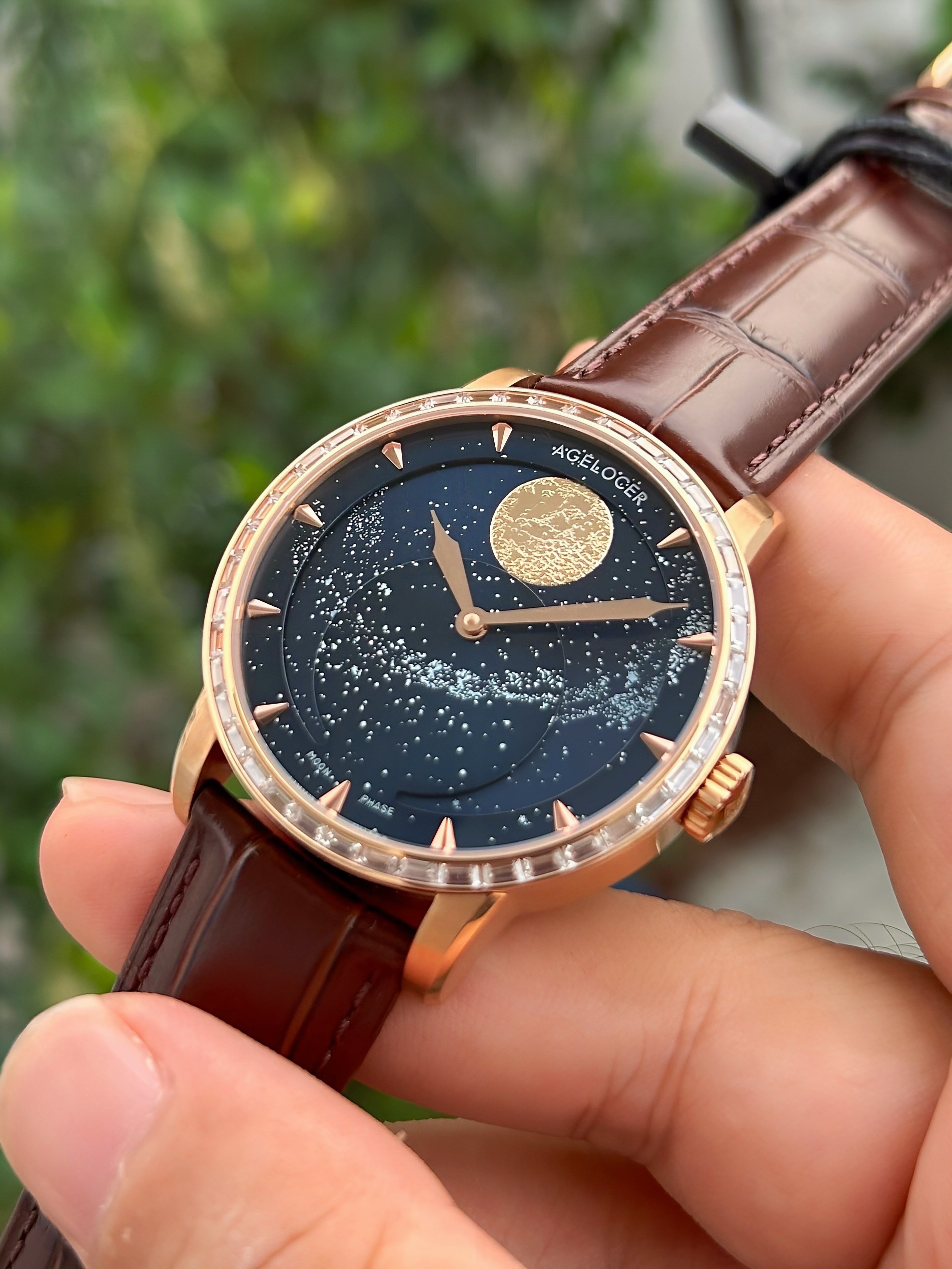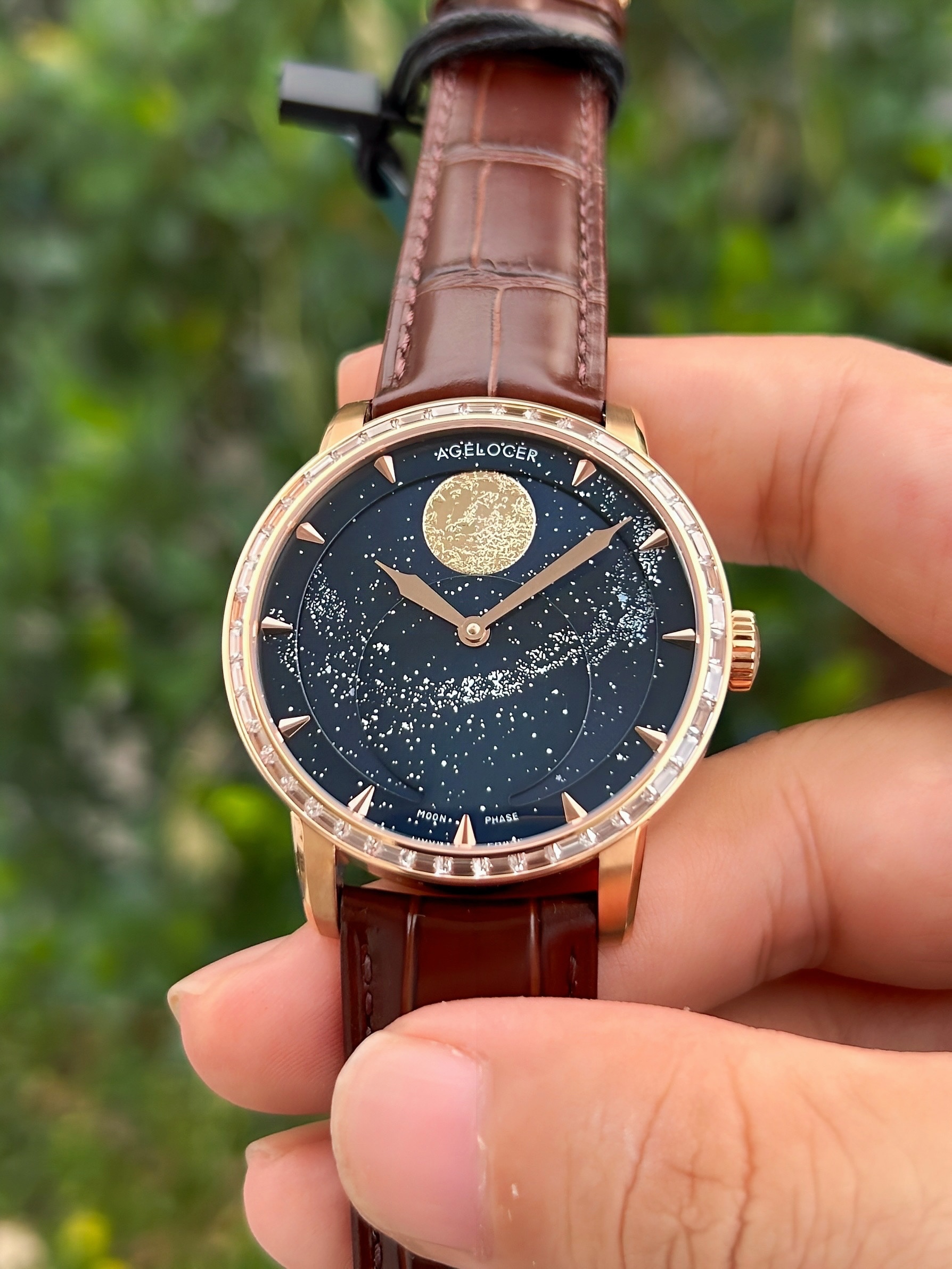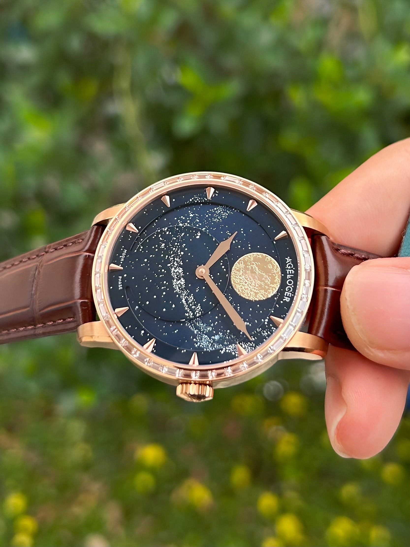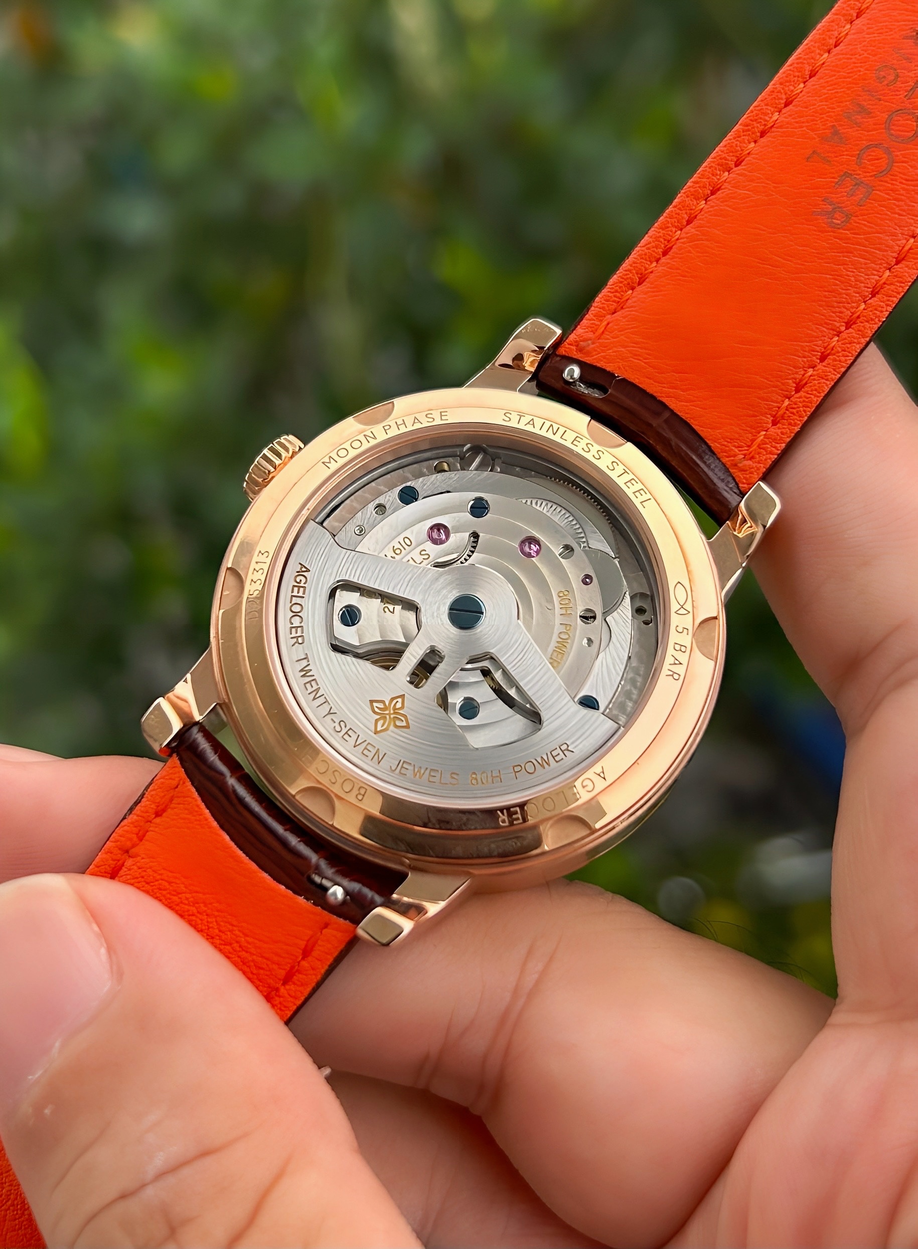 Agelocer 6404F2 là hiện thân của sự sang trọng tuyệt đối, nơi cơ khí gặp gỡ nghệ thuật trang sức. Chiếc đồng hồ này được khoác lên mình lớp vỏ mạ Vàng Hồng tinh tế, ôm trọn vành bezel rực rỡ bởi những viên đá quý lấp lánh, tái hiện hình ảnh dải ngân hà bao bọc lấy cỗ máy thời gian.Trọng tâm của mặt số là cửa sổ Lịch Tuần Trăng (Moonphase) được thiết kế phóng đại, một kỳ quan cơ khí phức tạp mô tả trọn vẹn chu kỳ trăng non, trăng khuyết đầy thi vị. Nguồn sống của 6404F2 là bộ máy Automatic Cal.A4610 độc quyền, đảm bảo độ chính xác cao cùng khả năng dự trữ năng lượng ấn tượng lên đến 80 giờ. Đây là một tuyên ngôn về phong cách, dành cho những người trân trọng sự xa hoa, tinh xảo và khao khát nắm giữ vẻ đẹp vĩnh cửu của vũ trụ trên cổ tay.