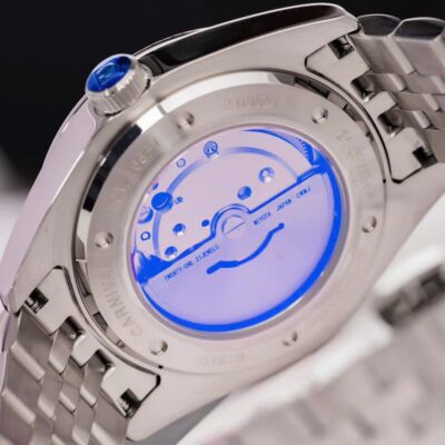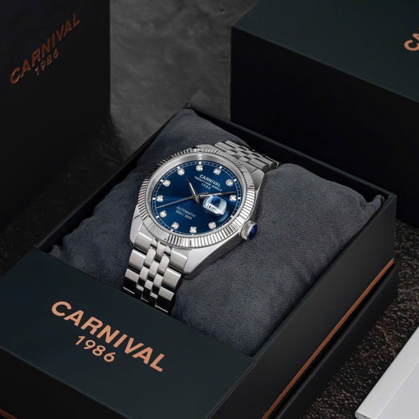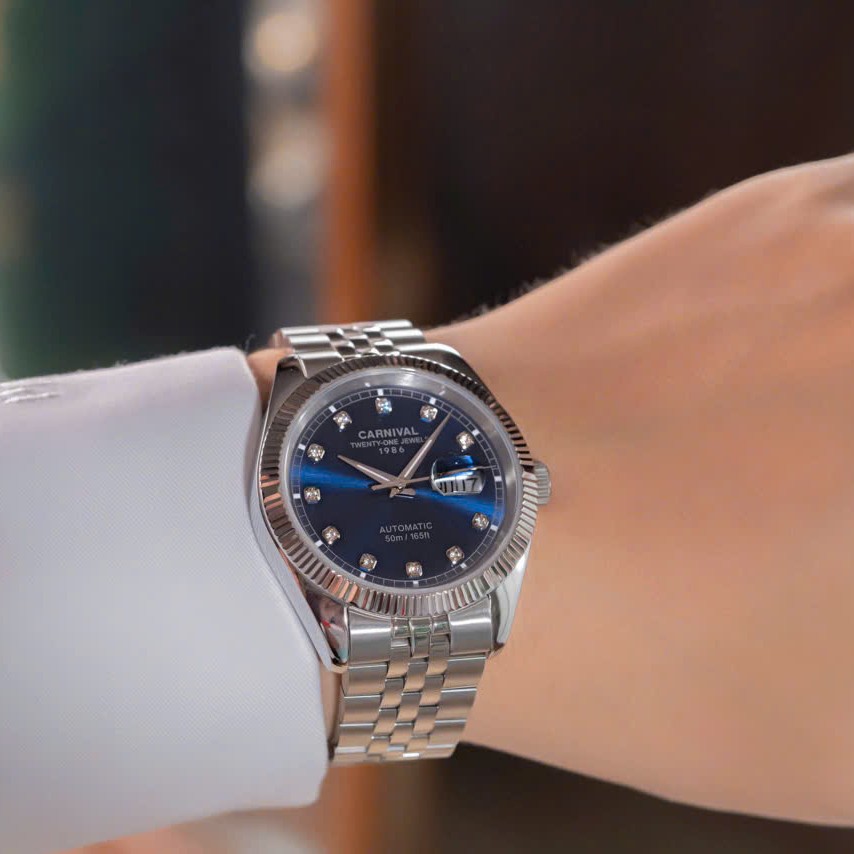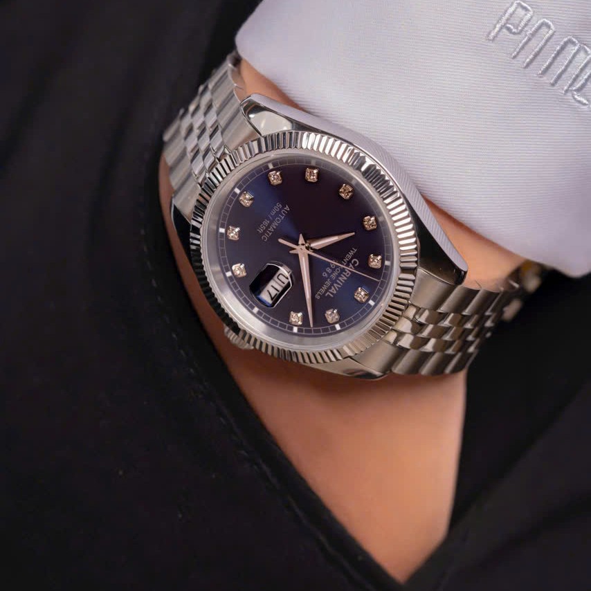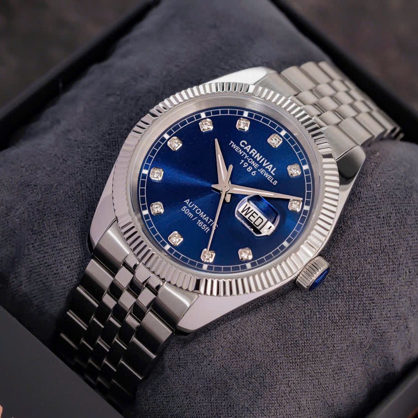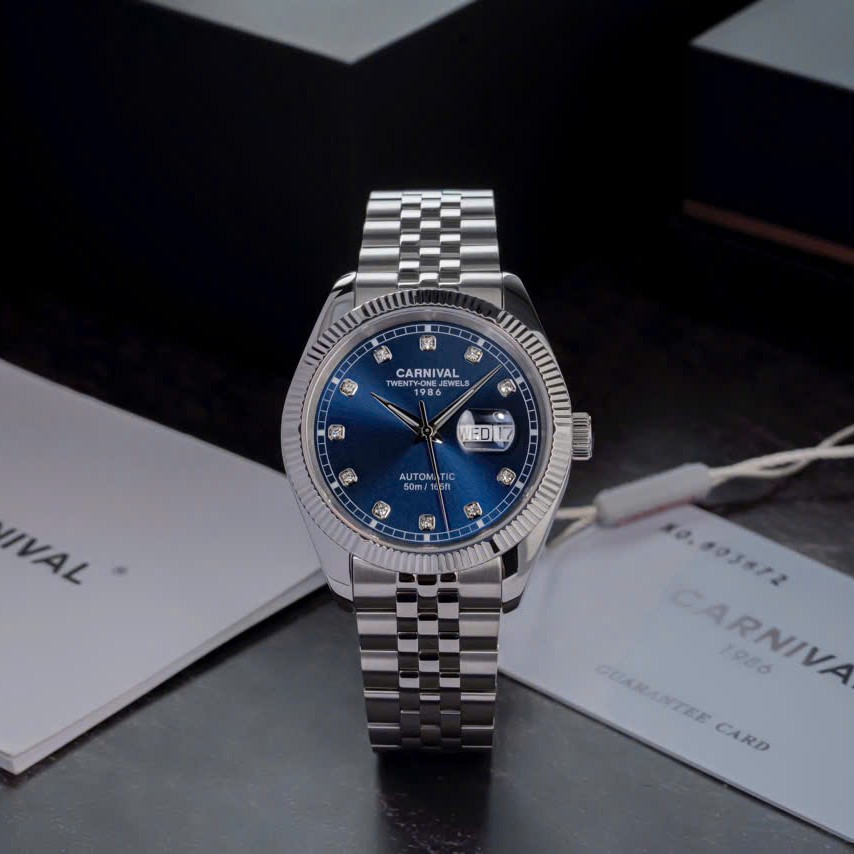 ⚜️ Tông màu mặt xanh, dây full trắng, cùng vành bezel niềng khía đậm chất của các mẫu Rô Lếch, mặt số gắn đá Swarovski