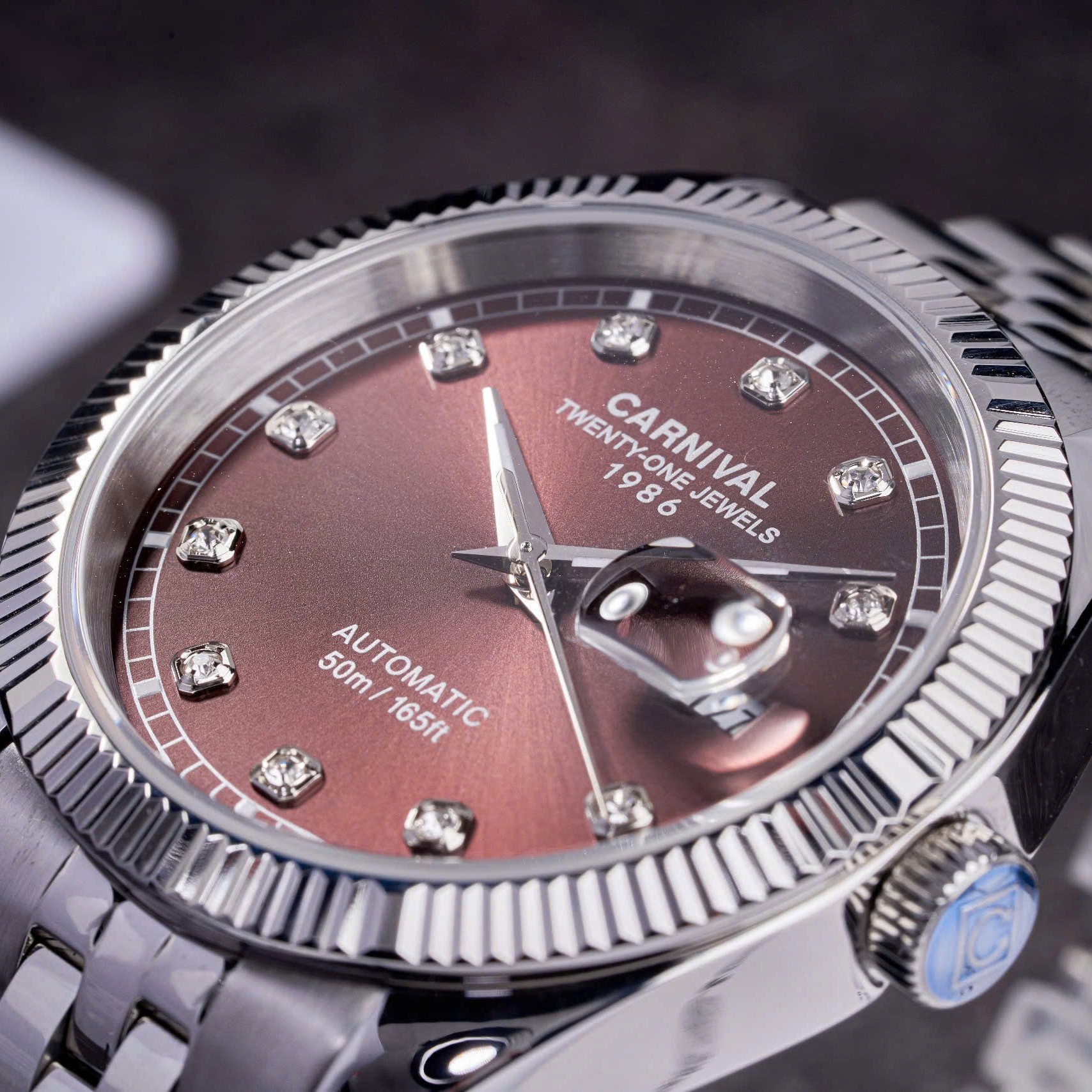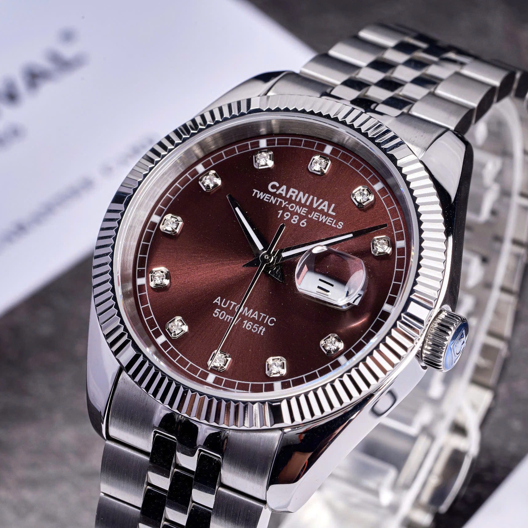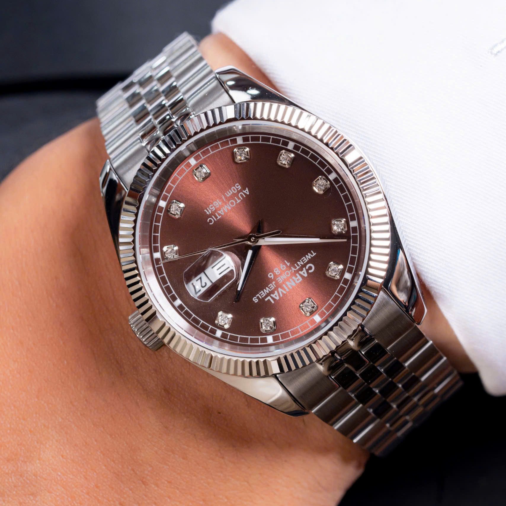 ⚜️ Tông mặt nâu cafe, dây full trắng, cùng vành bezel niềng khía đậm chất của các mẫu Rô Lếch, mặt số gắn đá Swarovski