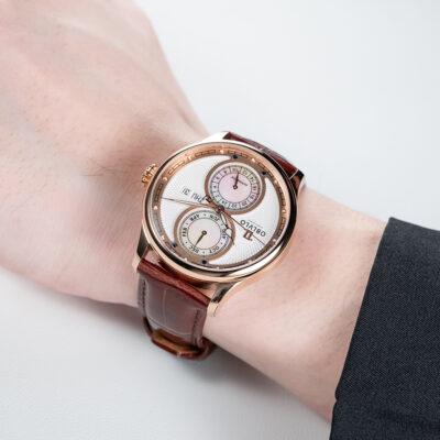 Thiết kế Dial độc bản: Mặt số nổi bật với họa tiết Guilloché hình sóng tỏa ra từ tâm, kết hợp hai vòng sub-dial khảm trai (Mother of Pearl) tạo hiệu ứng tán sắc sang trọng.