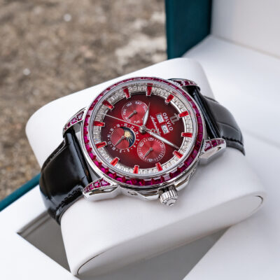 🎨 Phiên bản: 1. Classic Brown: Tone nâu trầm ấm, đính đá trắng thanh lịch. 2. Rainbow Red: Mặt đỏ quyền lực với vành đá đa sắc màu độc bản.