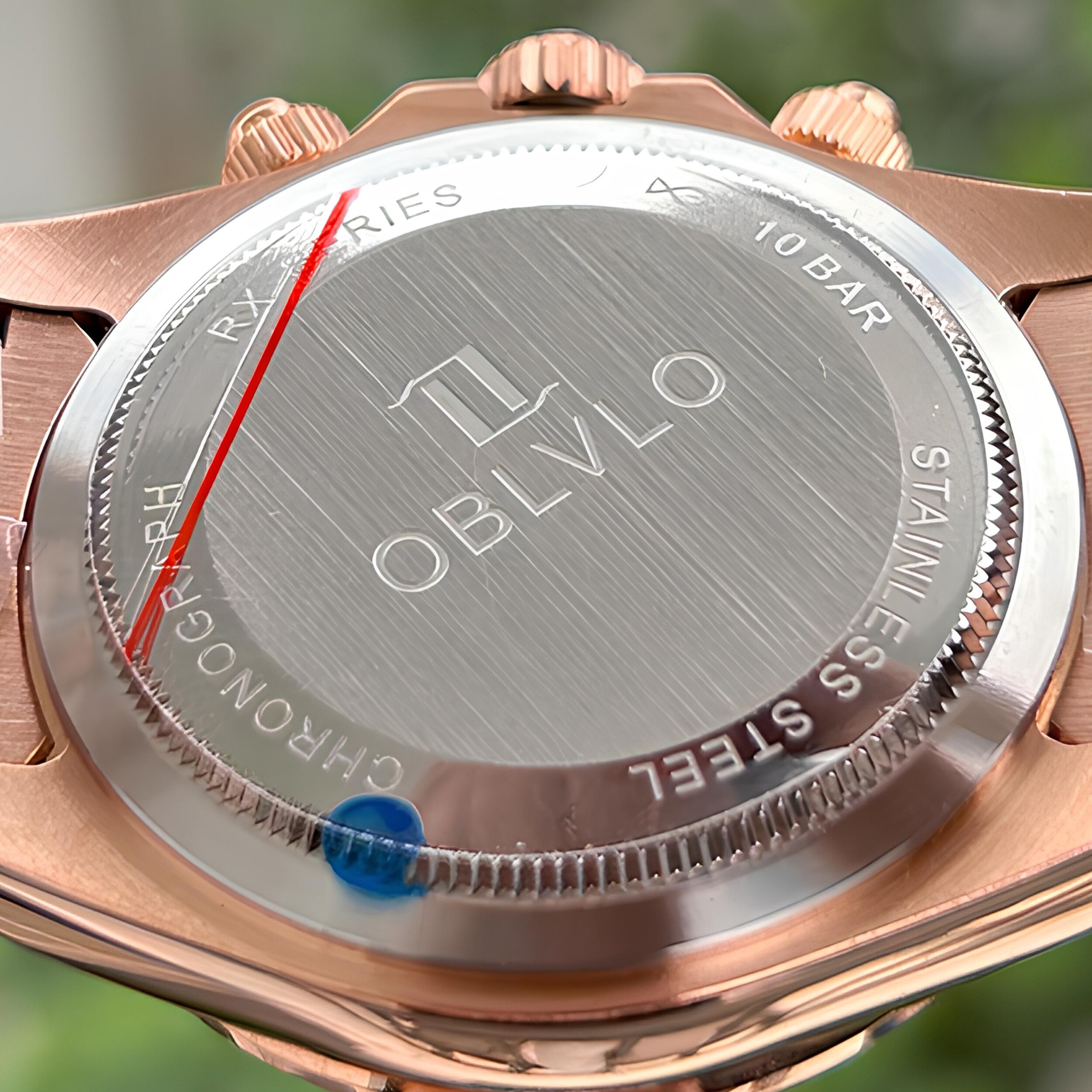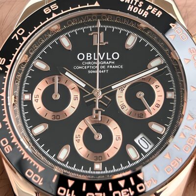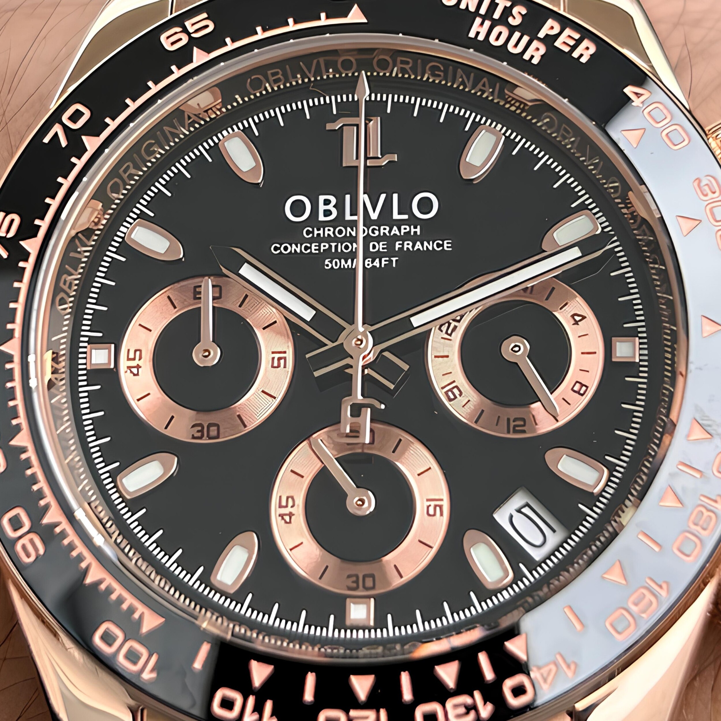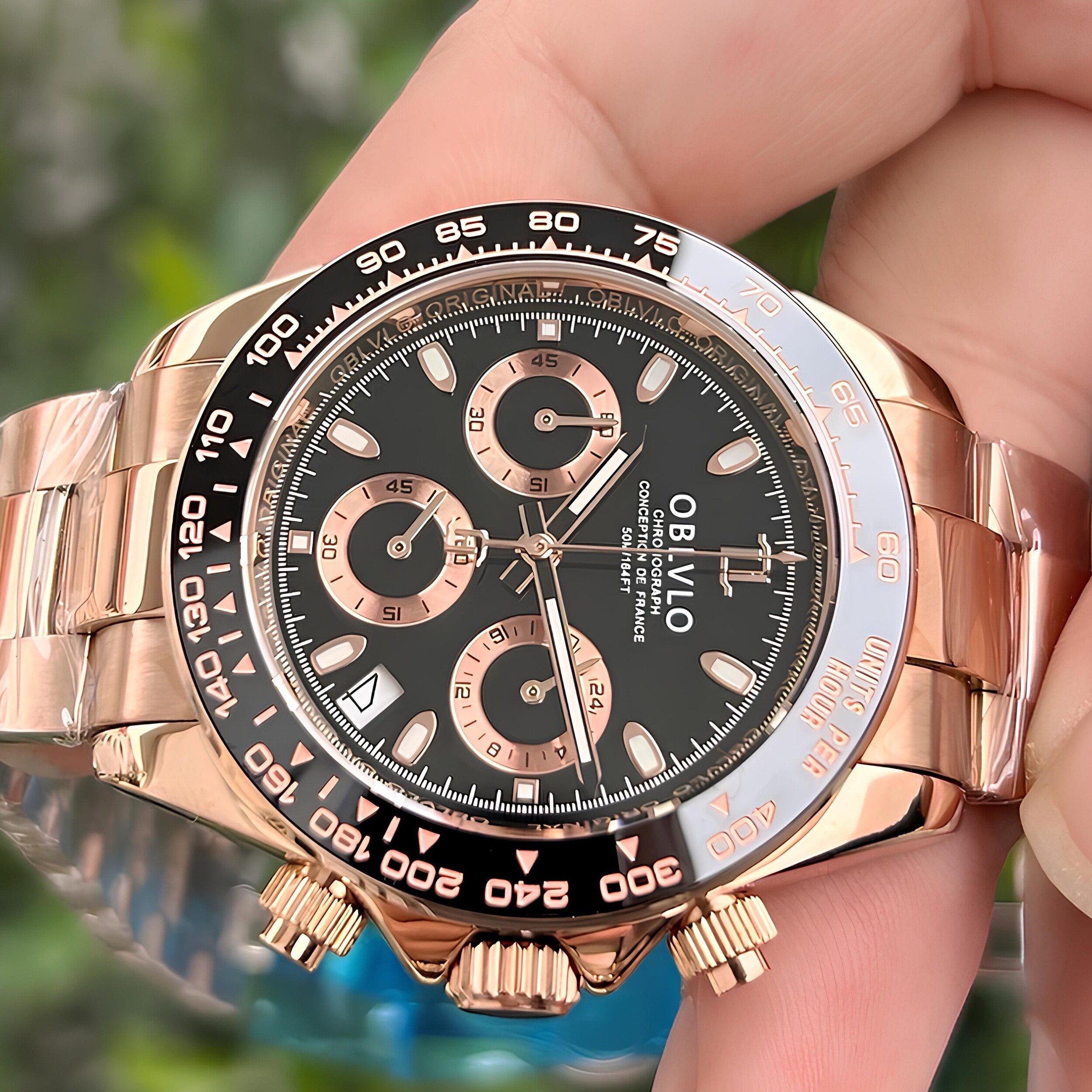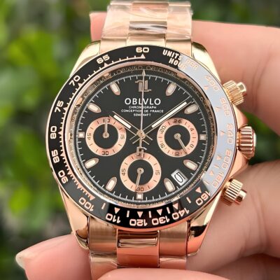 Đây là mẫu đồng hồ Chronograph đa năng, một thiết kế lý tưởng mà bất kỳ tín đồ nào của tốc độ và những cung đường cũng đều khao khát sở hữu. Mặt số đen nổi bật với bố cục tam giác ngược cổ điển, bao gồm ba mặt số phụ hiển thị: 24 giờ, 60 phút và 60 giây. Hệ thống điều khiển được bố trí tối ưu với nút bấm ở góc trên bên phải để Bắt đầu/Tạm dừng và nút phía dưới để Thiết lập lại về không (Reset). Điểm nhấn tiện ích bao gồm cửa sổ lịch ngày nằm giữa vị trí 4 và 5 giờ, cùng thước đo tốc độ (Tachymeter) được tích hợp ở vòng ngoài mặt số.