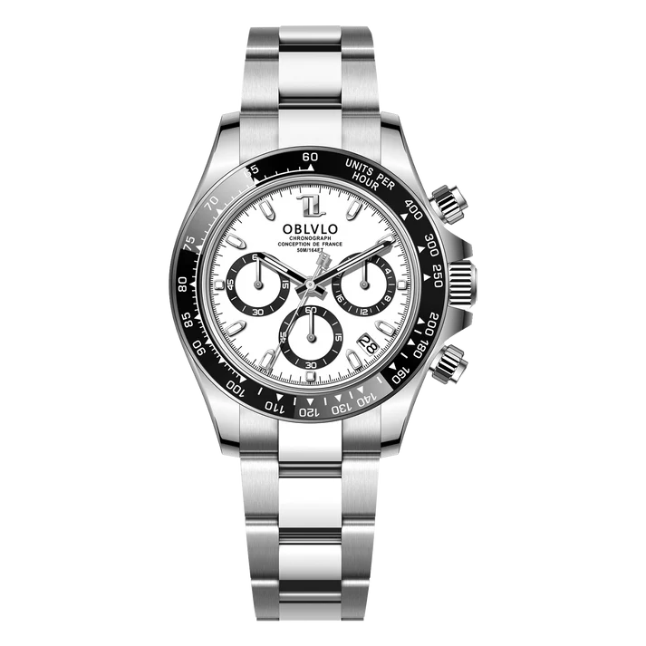 Đây là mẫu đồng hồ Chronograph đa năng, một thiết kế lý tưởng mà bất kỳ tín đồ nào của tốc độ và những cung đường cũng đều khao khát sở hữu. Mặt số đen nổi bật với bố cục tam giác ngược cổ điển, bao gồm ba mặt số phụ hiển thị: 24 giờ, 60 phút và 60 giây. Hệ thống điều khiển được bố trí tối ưu với nút bấm ở góc trên bên phải để Bắt đầu/Tạm dừng và nút phía dưới để Thiết lập lại về không (Reset). Điểm nhấn tiện ích bao gồm cửa sổ lịch ngày nằm giữa vị trí 4 và 5 giờ, cùng thước đo tốc độ (Tachymeter) được tích hợp ở vòng ngoài mặt số.