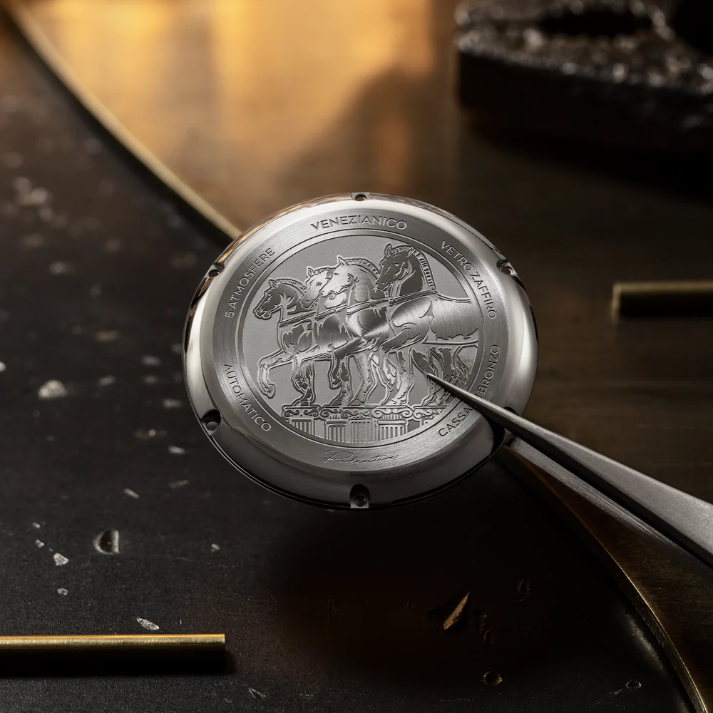 Lấy cảm hứng từ những chú Ngựa của Thánh Mark (Horses of St. Mark) huyền thoại, Redentore Bronzo tôn vinh nghệ thuật và truyền thống vùng Venice thông qua kỹ nghệ chế tác trên chất liệu đồng đậm chất lịch sử. Mặt số thủ công sở hữu lớp hoàn thiện mang hiệu ứng phong hóa (weathered finish) làm nổi bật cá tính riêng biệt, trong khi dây da Ý với bề mặt mài xước tạo nên sự đồng điệu với kết cấu của đồng, mang đến cho chiếc đồng hồ một phong cách vừa nguyên bản, vừa tinh tế.